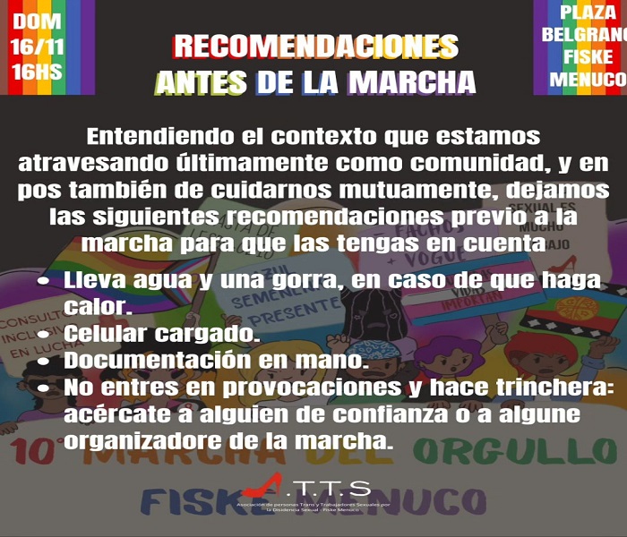 Desde ATTS convocan a una nueva marcha del orgullo en nuestra ciudad. 10 años de lucha, resistencia y sobre todo ORGULLO de poder ser y existir. La nueva fecha (por las inclemencias del tiempo) va a ser este domingo 16 de noviembre en la Plaza Belgrano a partir de las 16hs, la marcha comienza a las 18hs.