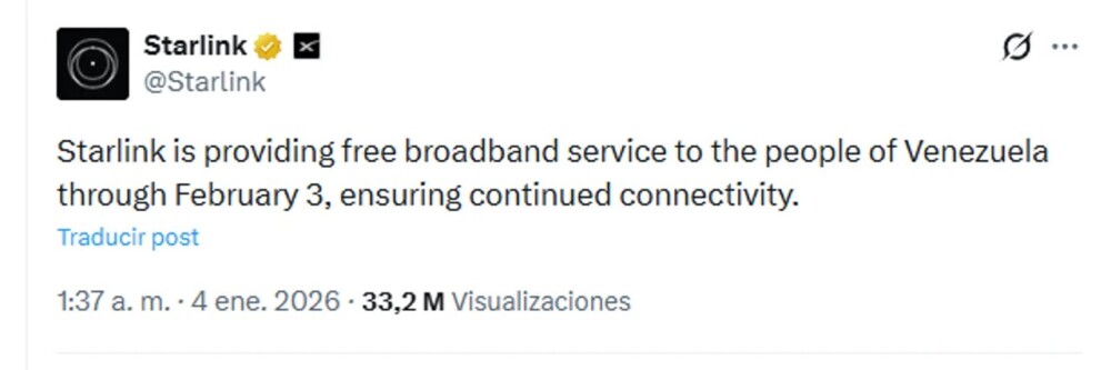 En una medida de impacto inmediato tras la captura de Nicolás Maduro, la empresa Starlink anunció que proveerá internet satelital gratuito a todos los usuarios en Venezuela. La compañía de Elon Musk confirmó que el servicio de banda ancha no tendrá costo hasta el próximo 3 de febrero.
