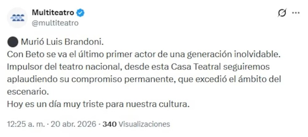 A su vez, el productor también adelantó que velarían los restos de Brandoni en la Legislatura Porteña desde el mediodía de este lunes, y el martes a la mañana en el Panteón de Actores, ubicado en el Cementerio de Chacarita.