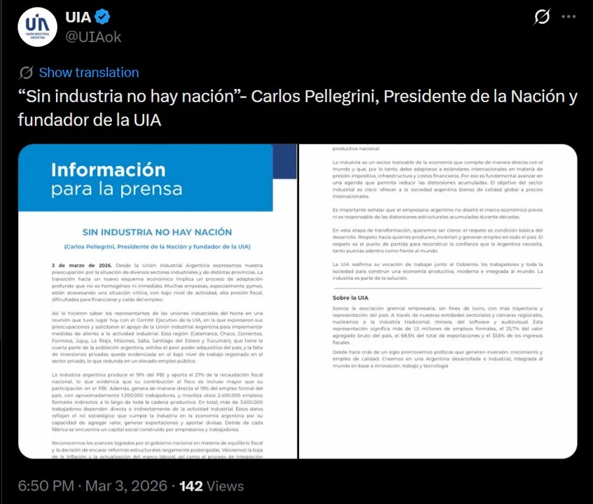 La Unión Industrial Argentina (UIA) salió al cruce luego del discurso del presidente Javier Milei en el Congreso, y utilizó una frase del expresidente Carlos Pellegrini: “Sin industria no hay Nación”.